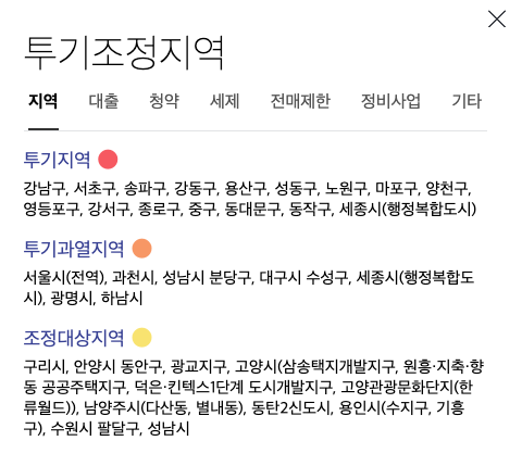 수도권 투기지역/투기과열지구/조정대상지역 입니다. 투기지역 : 강남구, 서초구, 송파구, 강동구, 성동구, 노원구, 마포구, 양천구, 영등포구, 강서고, 종로구, 중구, 동대문구, 동작구 투기과열지구 : 서울시(전역), 과천시, 성남시, 분당구, 대구시, 수성구, 세종시(행정복합도시 건설예정지), 광명시, 하남시 조정대상지역 : 구리