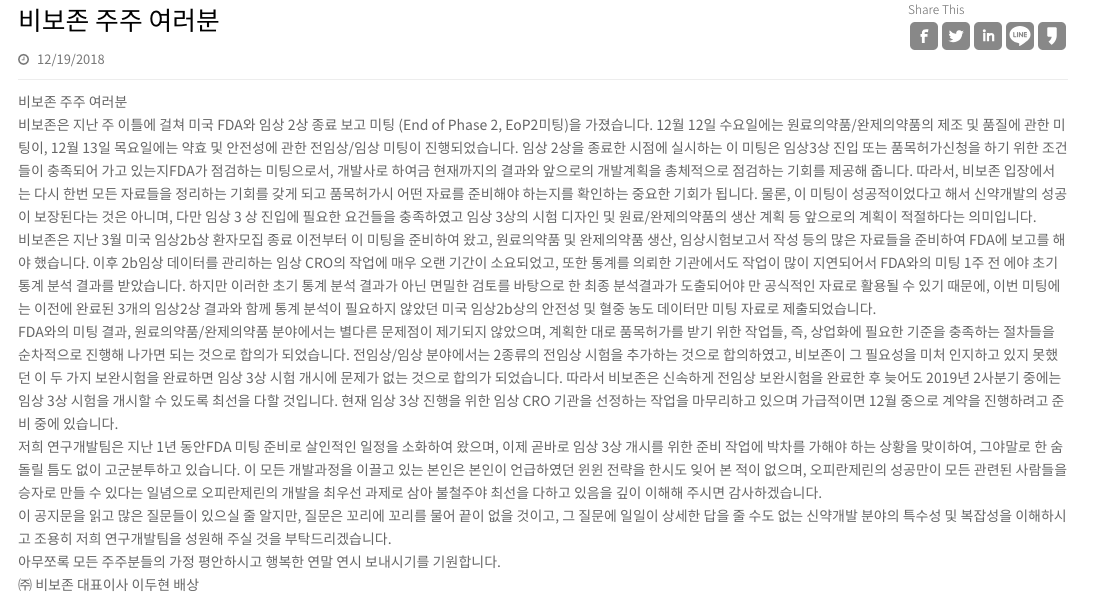 - 2018년 12월 19일 FDA와의 2상 종료미팅 후 결과를 공고했다. 2b상 종료 미팅은 문제없이 잘 마쳤고 2종류의 전임상 시험을 추가하는 것을 합의